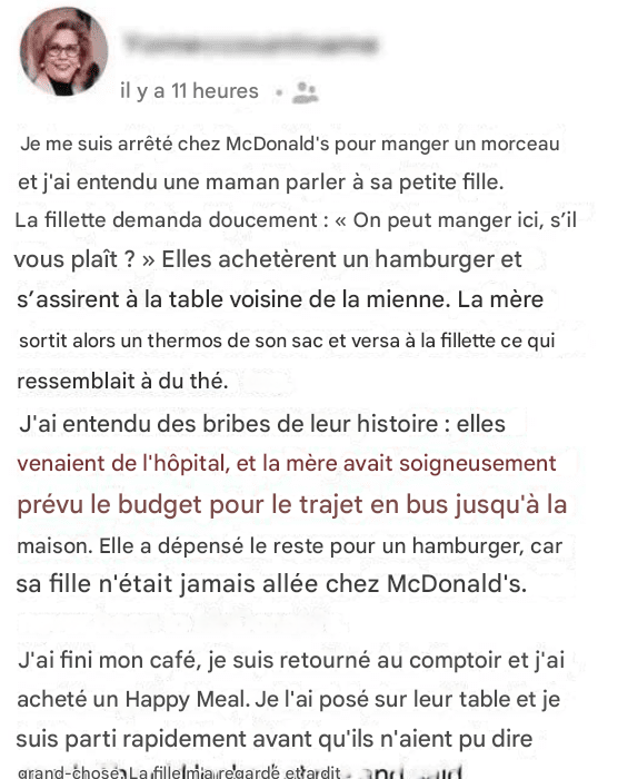 Je me suis arrêté chez McDonald’s pour un petit morceau rapide, espérant décompresser après une longue journée fatigante. L’arôme familier des frites et des galettes grésillantes emplissait l’air alors que je me dirigeais vers le comptoir. Alors que je restais là, attendant ma commande, mon regard a erré à travers le restaurant, où des familles et des groupes d’amis étaient assis, discutant et riant.